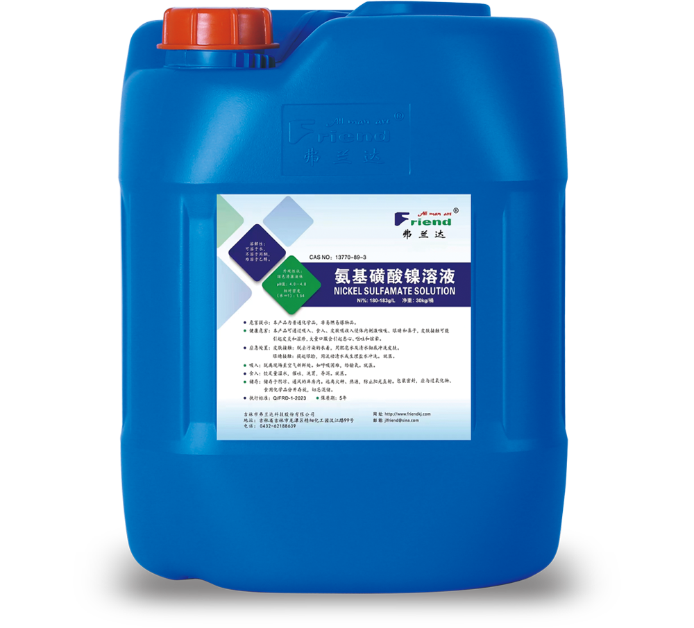 氨基磺酸鎳溶液(Nickel Sulfamate Solution) 分子式:Ni(NH?SO?)? 分子量:250.87 性 狀:深綠色透明液體。 特 性:高純鎳粉為原料;產品純度高,穩(wěn)定性好。 用 途:主要用于精密電鍍、電鑄、電子工業(yè)等。 包 裝:HDPE桶裝,每桶30公斤。 儲 運:運輸時包裝要密封,運輸過程中防止受熱,貯存在陰涼,通風處。